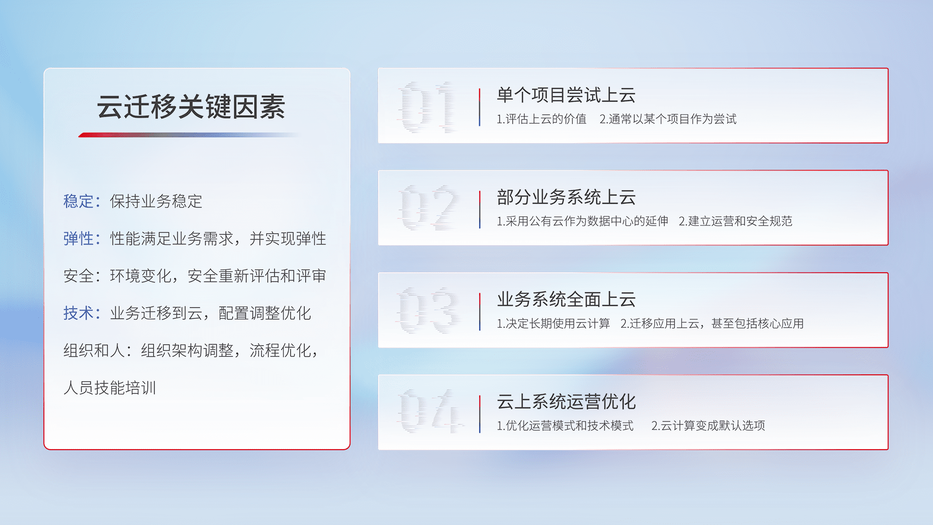 结合实际业务,,,从规划设计、、、、云平台选型、、、云原生改造、、、、数据迁移、、、集成交付,,,迁移全过程为客户识别最佳上云路径,,,做好风险识别管理,,,设计网络架构、、、身份权限、、安全审计合规、、操作审计、、、、日志审计、、、、监控告警策略、、、、多站点容灾设计等,,,对云上基础设施进行整体规划,,,提升IT治理水平,,以满足弹性、、高可用、、、、高性能的需求。。。。