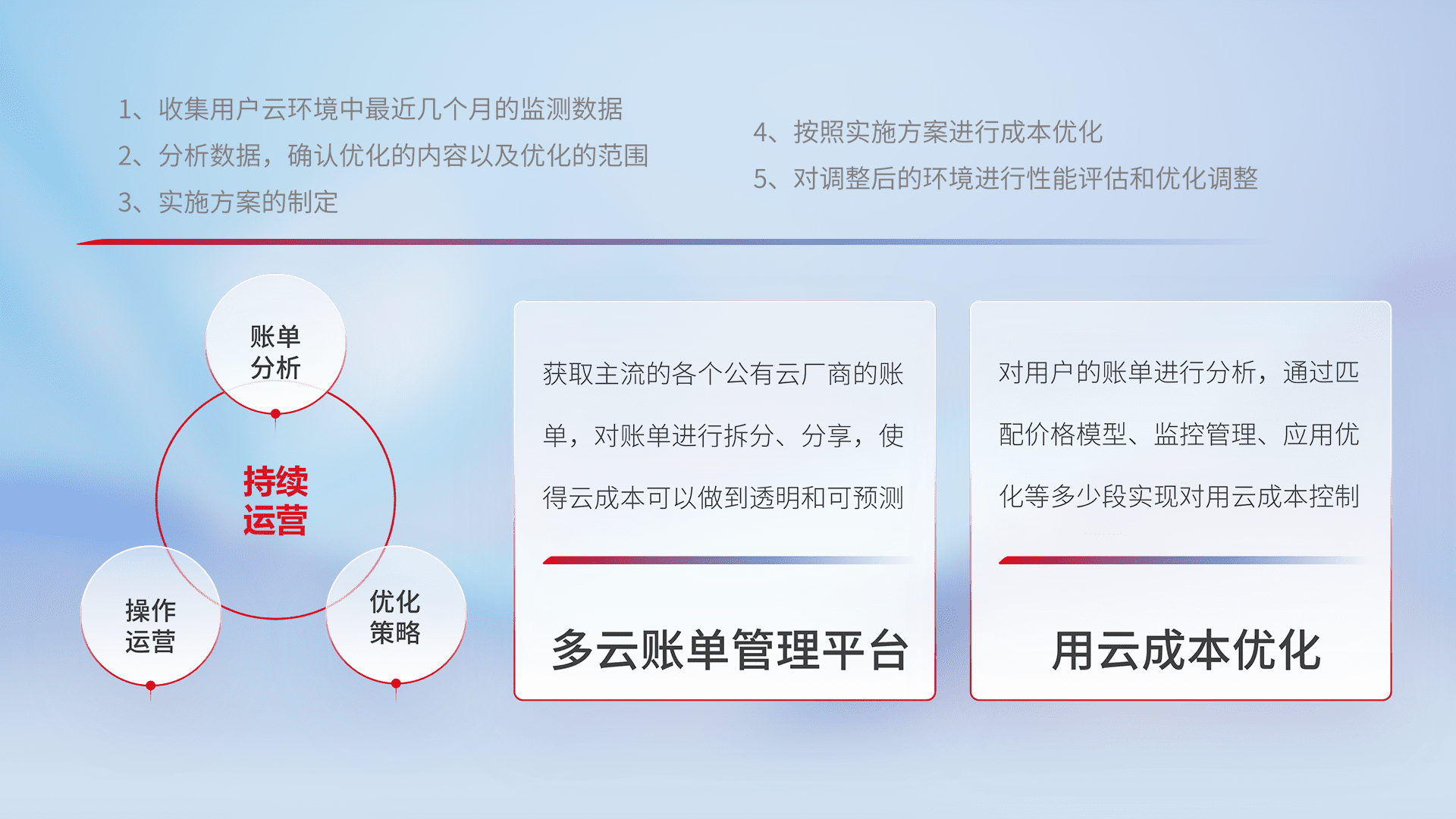 通过多云纳管,,,,以统一的资源数据模型把客户的云资源进行抽象和封装,,进而实现对多云资源的统一操作,,,保障云资源管理的可靠性、、、、稳定性与可用性。。量身定制化运维内容,,配置、、、、开发运维、、、、补丁管理、、、备份、、、监控、、、、认证和访问管理、、、、审计和日常巡检等,,,保障在用云过程中的可靠度,,稳定度以及高可用率。。。。